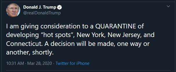 Headline from WaPo: "Trump says he is considering a quarantine on New York, parts of New Jersey and Connecticut "