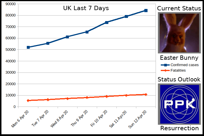 I hope this forces Johnson and the rest of the Tories to look at the NHS in a better light. A friend of mine works as a doctor in the NHS and the consensus among her peers and her is that the Conservatives under fund the NHS yet treat it as a means to score political points (ie. Vote Leave to Save the NHS £350 million a week!). She believes that they would privatise the NHS if they could. They certainly can't now, it would be political (and literal) suicide.UK numbers for today 12th April: