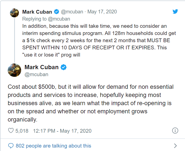 He's not wrong. That's what we have in Canada at the moment. $2k every month for people who for some reason don't qualify for normal employment insurance. The whole goal is to put money into working and middle class people who would actually spend that money (because they have to) and thus keep the economy from collapsing. Consumer demand among the middle class is afterall the lifeblood of any country's economy. The other side effect is that people will be less likely to go out and protest (because they actually have money to pay the bills and not starve) and spread this virus around even further.