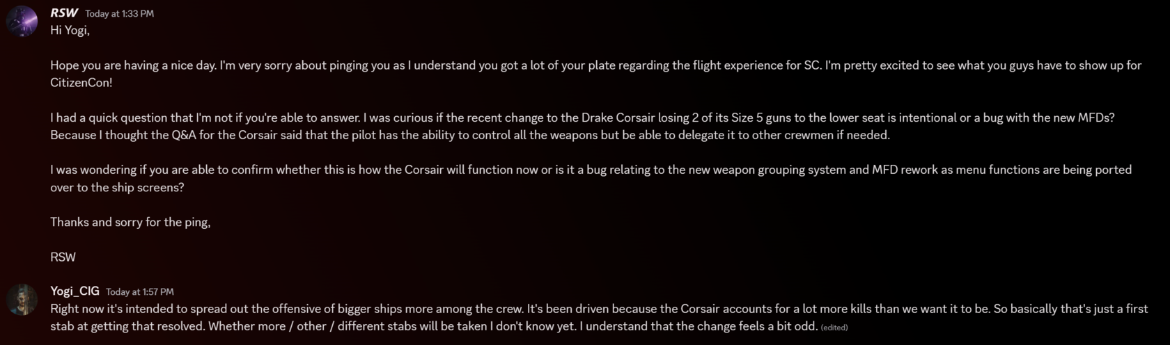 New ship has 6 size 4 guns and the pilot controls only 2 of them so it will be far below in DPS.100% the nerf is because of a shiny new ship coming in at CitCon....and at the same price lol. To the person posting on YT or Reddit on the video, no, the new ship doesn't have to be $5 less than the Corsair, since there are no more $0 CCU's, lol.