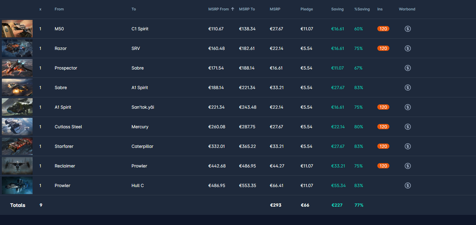 Basically playing the CCU game for fun and to throw a little money at CIG. Not sure what I even want with this now. I just know that I don't want the Hull C :D (want the SRV maybe, that's why I also put it in there otherwise I stuck to chainable stuff). Maybe Liberator or Odissey? Think there might be more stuff coming up to close the gabs? VAT is making this a little annoying for calculation so thx for your lists guys.