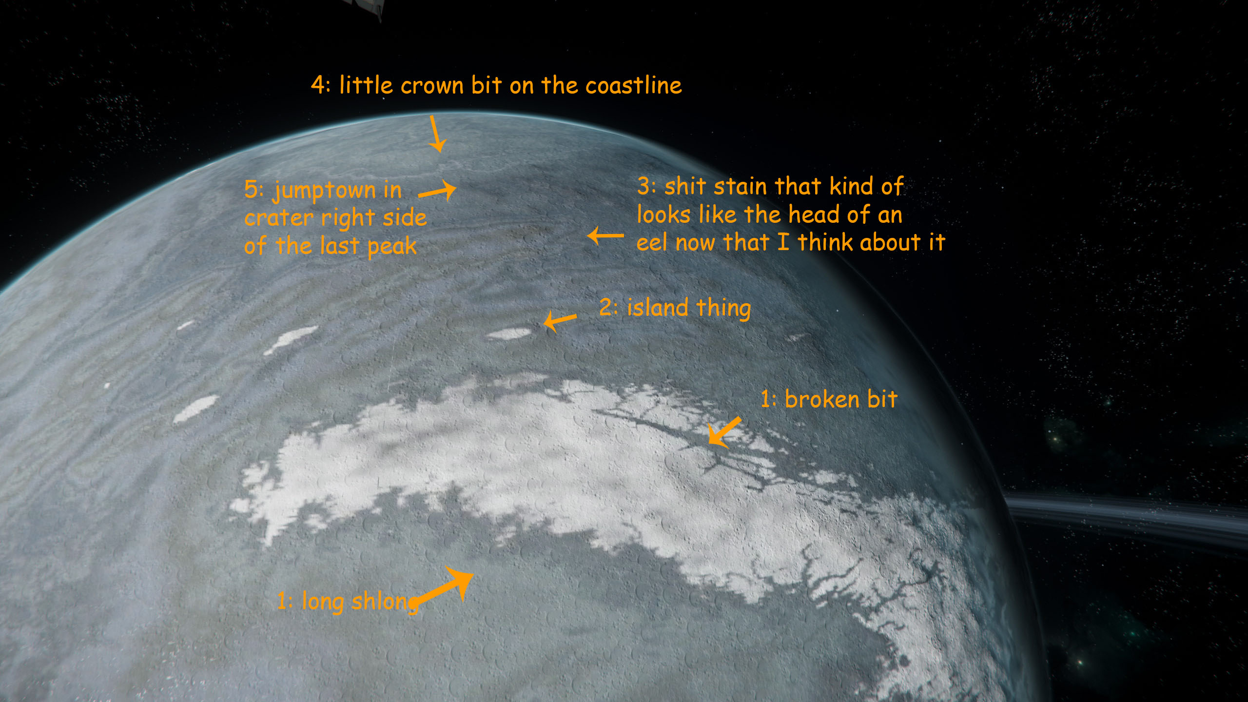 Look for the long shlong with the broken bit. Draw a line between the island thing next to it, past the shit stain, to what looks like a headland on a coast line. On a line from the island thing to this is a darker blob of mountain range that contains Jumptown in a crater to the right side at the very end.