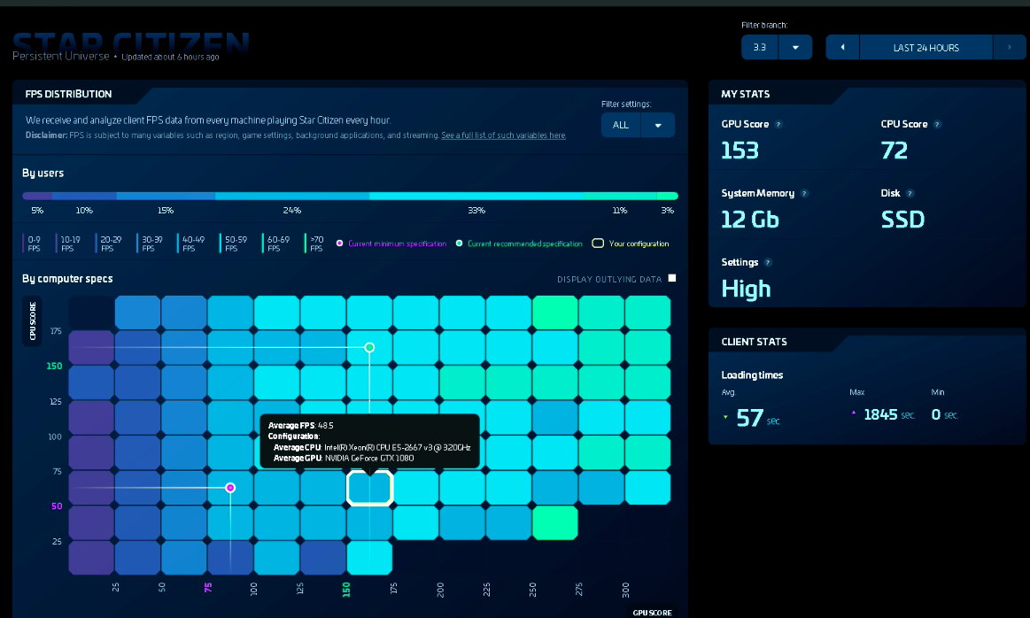 EDIT: Ok, here is the screenshot of the RSI Telemetry page for this...NOTE--> This is somewhat artifcial, as it really describes the interactions between the RSI Servers and the Shadow.tech servers...what gets passed on to me as a result of the streaming can be somewhat different, as my internet connection can vary, my ISP may throttle me, etc. This just shows that Shadow.tech is giving me what they say they are, i.e., the RSI servers see it as this and track the FPS this configuration gets.